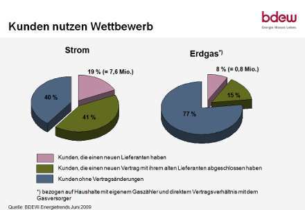 Inzwischen haben knapp zwei Drittel aller Haushalte beim Strom und gut ein Fünftel beim Gas entweder ein neues Produkt bei ihrem bisherigen Anbieter oder einen anderen Lieferanten gewählt. Konkret haben 60 Prozent der Privathaushalte seit Beginn der Liberalisierung im Jahr 1998 aktiv einen neuen Stromtarif oder einen neuen Stromversorger gewählt, so der BDEW. Das sind neun Prozent mehr als noch am Jahresende 2007 mit 51 Prozent.