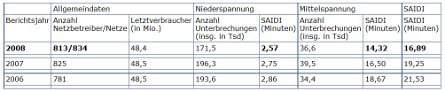 In die Erhebung gehen nach Angaben der Behörde nur ungeplante Unterbrechungen ein, die länger als drei Minuten dauern. Ausfälle infolge höherer Gewalt würden dagegen nicht berücksichtigt. 2007 waren infolge des Orkans Kyrill noch Störungen wegen höherer Gewalt von 16,42 Minuten gemeldet worden. 2008 sei dieser Wert dagegen auf 1,2 Minuten gesunken.