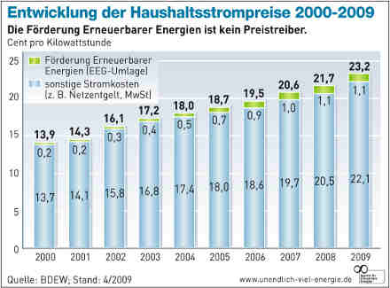Die Strompreise für Haushalte haben sich durchschnittlich zwischen 2006 und 2009 um 3,75 Cent je Kilowattstunde erhöht, sagt der Bund der Energieverbraucher. Verringert haben sich dagegen in diesem Zeitraum die Netzentgelte, und zwar um 1,5 Cent je Kilowattstunde. Zieht man die Steuern, Abgaben und Netzentgelte vom Strompreis ab, dann haben sich die Kosten für Erzeugung und Vertrieb um über vier Cent je Kilowattstunde in nur drei Jahren erhöht. Die Spotmarktpreise an der Strombörse haben sich in diesem Zeitraum jedoch um 1,2 Cent je Kilowattstunde verringert.