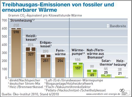 Die Wärmepumpen schneiden gegenüber Stromheizungen mit um mehr als zwei Drittel niedrigeren Emissionen pro Kilowattstunde deutlich besser ab. Aber auch gegenüber einem modernen Erdgas-Brennwertkessel kann eine Wärmepumpe die klimarelevanten Emissionen um 33% reduzieren. Und hierbei wurde der mögliche Einsatz von Ökostrom und der weiter zunehmende erneuerbare Anteil am deutschen Strommix noch gar nicht berücksichtigt.