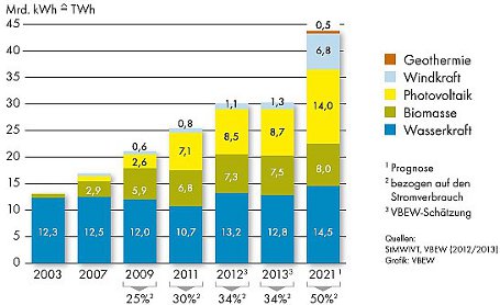 Erneuerbare Energien haben 2013 in Bayern rund 34 Prozent des Stromverbrauchs gedeckt. Damit ist der Anteil Erneuerbarer deutlich angestiegen, betrug der Anteil im Jahr 2009 doch 25 Prozent waren.