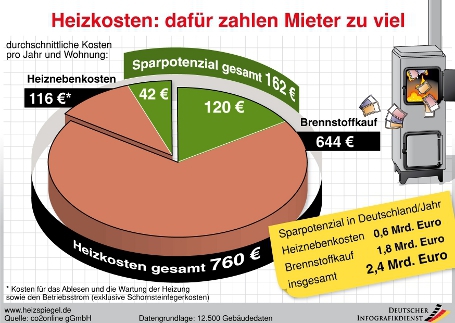 Demnach sind bislang wenig beachtete Faktoren für einen großen Teil der unnötigen Heizkosten verantwortlich: Von den 760 Euro, die deutsche Mieter im Schnitt pro Jahr für Heizkosten ausgeben, können sie 160 Euro sparen. Von diesem Einsparpotenzial entfallen 120 Euro auf den Brennstoffeinkauf und 40 Euro auf die Heiznebenkosten. Diese setzen sich wiederum aus Messdienstleister-, Wartungs- und Betriebsstromkosten zusammen.