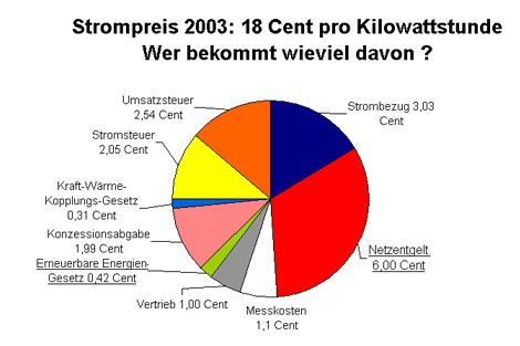 Einen großen Anteil an den aktuellen Strompreisen haben die Netznutzungsgebühren. Im Jahr 1988 berechnete das Energiewirtschaftliche Institut der Universität Köln die Kosten der Stromverteilung und des Vertriebs mit 3,6 Cent je kWh. Die Kostenträgerrechnung des Berliner Stromversorgers Bewag für das Jahr 1998 bestätigt diese Zahl. Tatsächlich zahlen Haushaltskunden derzeit rund 6,8 Cent Netznutzungsgebühren für jede verbrauchte Kilowattstunde. Das sind gut drei Cent pro Kilowattstunde zu viel. Die Netznutzungskosten machen derzeit ein Drittel des Strompreises aus, während die eigentliche Stromerzeugung nur ein Sechstel des Preises ausmacht.