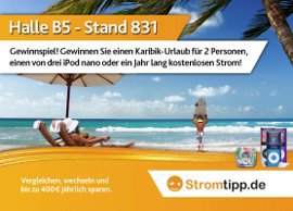 Das unabhängige Energieverbraucherportal Stromtipp.de ist auf der großen Verbraucherausstellung "Du udn Deine Welt" in Hamburg vom 14.11. bis 22.11.09 mit einem eigenen Stand vertreten. In Halle B5, Stand 831 erwartet den Messebesucher unser freundliches Stromberaterpersonal, das Ihnen unverbindlich bei der Auswahl eines neuen Stromanbieters hilft. Doch nicht nur deshalb lohnt ein Besuch, denn mit etwas Glück können Sie kostenlos in die Karibik fahren! Stromtipp.de verlost auf dem Messestand eine Karibik-Reise für zwei Personen, iPods sowie Strom für ein Jahr.Stromanbieterwechsel bietet großes Einsparpotenzial