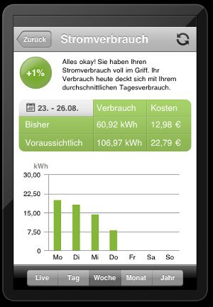 Grafisch und inhaltlich schön gelöst ist die Auswertung des jeweilgen Verbrauchs. Die wichtigsten Infos lassen sich in verschiedenen Zeiträumen darstellen, und auch die Kosten sind transparent. Diese sind schließlich ein wesentlicher Anreiz zum Stromsparen.